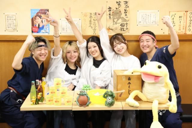 仕事情報 ● 仕事内容 本当に仕事中?!(笑)ってくらいみんな笑ってばっかりの蛙之介♪お客さんもノリが良くて優しい方ばかり! アルバイトスタッフの意見も「いいじゃん!」ってどんどん採用するので、イベントや楽しい割引なども沢山!あなたのアイディアも大歓迎◎ 堅苦しい接客はいりません!地域に愛されるお店を一緒につくっていこう! 愉快ないじられ店長の店! 野球を愛するいじられ店長「かず」(26)が目指すのは「悩みも吹き飛ぶくらい楽しいお店」!お客さんも巻き込んで超楽しい空間を作っています。 シフトの自由度も抜群◎髭もピアスも髪色も自由!あなたの最高の居場所になること間違いナシ☆ 今年はアルバイトのみんなで沖縄旅行にも行きました! 個性豊かなメンバー活躍中 誰とでもすぐ仲良くなっちゃう人懐っこいコミュ力お化け!「のあ」(21) 見た目は超ギャル!でも誰よりも心の優しい皆のお姉さん♪「ゆゆ」(23) とにかく元気が取り柄!(笑)イベント企画も得意なアイディアマン!「りょうた」(24)etc… 明るくて、仲間想いなスタッフが多数活躍中! 頑張り次第で時給UP! 「お客さんの名前を10人覚えた!」「毎日掃除をコツ×2やってる!」「かわいいポップを作た♪」など、日々の頑張りがしっかりとお給料に反映されます! 頑張った結果、毎月のお給料+10000円のボーナスをもらったスタッフも!頑張りが評価されるので、続ければ続けるほど楽しくなる職場です★ 仕事内容 ホール業務(オーダー取り・ドリンク・料理提供など)をお任せ!
