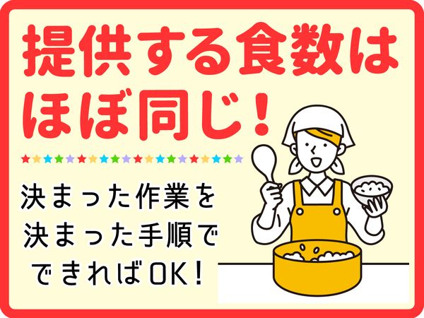 仕事内容 ゚*.。.*゚*.。.*゚*.。.*゚*.。.*゚*.。.*゚ 応募は約1分で応募完了!応募時は必須項目の入力のみでOKです◎ ゚*.。.*゚*.。.*゚*.。.*゚*.。.*゚*.。.*゚ <仕事内容> 家事の延長線でできるかんたんな調理補助の仕事をお任せいたします。 ■具体的には ・野菜の下処理 ・簡単な盛付 ・調理器具、食器の洗い物 など ・簡単な接客(食事の提供) *未経験者でも丁寧に研修致しますのでお気軽にご応募ください。 「こっちは任せて!」「ありがとう!とっても助かる~!」と 声を掛け合いながら、和気あいあいとした 温かい環境の中で働けます! 優しく面倒見のいいスタッフが多いので、 雰囲気もよく居心地抜群!未経験の方でもすぐ馴染めますよ! =============== 働きやすいポイント! =============== 利用者は社員さんがメイン!社員食堂等での勤務経験がない方もご安心ください! 各ポジションのメンバーみんなで役割分担しながら協力していけるのでスムーズに対応できます。 簡単な盛付作業になりますので、どんな方でも安心!笑顔が素敵な先輩スタッフが親切丁寧に指導しますので、未経験の方でも大歓迎です。 ============= 家での炊事スキルでパートを始めよう! ============== 「レジとか事務はできないけど、キッチンには毎日家で立ってるし♪」 そんな未経験の主婦さん中心に活躍中です! とはいえ、難しい調理スキルも必要ないため、料理が苦手な方でも問題ありません。 「子供のお弁当を詰めるのが好き♪」 「洗い物を手際よく片付けるのが得意♪」 そんなあなたの小さな「スキ」や「得意」が、ここではとっても重宝されます!
