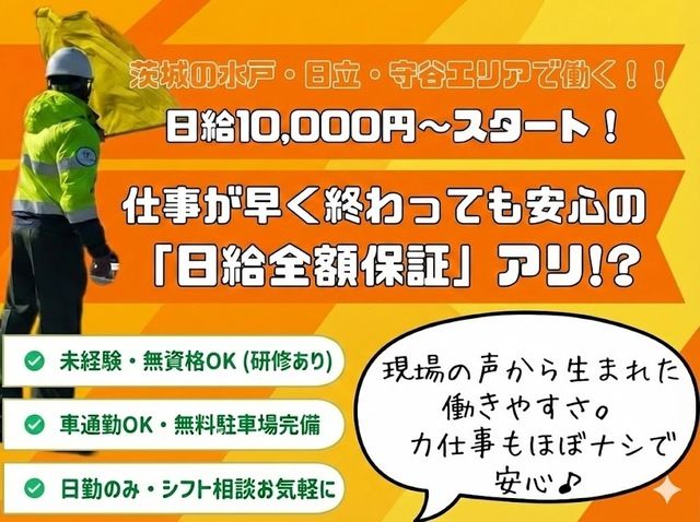 仕事内容 \あなたの警備員デビューを応援します!/ “あちこち飛ばされない”安心の警備のお仕事。 いつもの現場・いつもの仲間で、長く続けられます。 「警備って難しそう…」 「未経験でもできるのかな?」 そんな不安がある方もご安心ください。 当社は未経験スタートのスタッフが多数活躍中。 年齢・経験を問わず始められる、あたたかく話しやすい職場です。 ■仕事内容 工事現場や建築現場の周辺で、 人や車が安全に通行できるよう見守るお仕事です。 具体的には… ・歩行者や車両への声かけ、誘導 ・工事車両の出入り時の安全確認 ・危険箇所での注意喚起 ・近隣の方への簡単なご案内 ▶ 最初は交通量の少ない現場からスタート ▶ 近くに先輩がいるので未経験でも安心 ▶ 無理のない業務量で体への負担も少なめ ■勤務地について(安定して働けるポイント) 現場は基本固定。頻繁な配置替えはありません。 ・「毎回場所が変わるのは不安…」という方も安心 ・いつもの現場・いつものメンバーで働けます ・移動の負担が少なく、長く続けやすい環境 ★日立市を中心に茨城県北エリアに勤務地多数あり★ ■入社後の流れ・研修 入社後すぐに現場へ出ることはありません。 基礎から学べる研修をご用意しています。 1.入社手続きのご案内 2.就業ルール・給与の説明 3.警備の基礎知識(座学) 4.誘導方法や無線機の使い方などの実技 一つずつ不安を解消しながら進めます。 【休日・休暇】 ・週休二日制 ・夏季、冬季休暇 ・介護休業取得実績あり ・年次有給休暇あり ・勤務表は本人希望を考慮 ※急なお休みにも対応しています。 【福利厚生・待遇】 ・社会保険完備 ・資格取得支援制度あり ・車、バイク通勤可 ・マイカー通勤可 ・無料駐車場完備 ・受動喫煙対策あり(屋内禁煙)