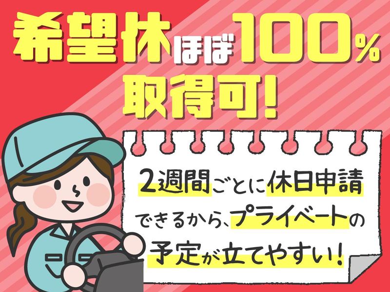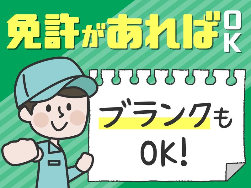 求めている人材 /// 経験も学歴も不問 /// 免許があればスタートできます! 中型免許の取得費用も会社が一部負担◎ お仕事ブランクからのスキルUPにも! 様々な世代の方が男女問わず活躍中! 【必須】 ・普通運転免許 ・60歳未満 (定年による/例外事由1号) ・夜勤シフトの場合は18歳以上 (深夜業務のため/例外事由2号) 【歓迎】 ・準中型免許または中型免許 (平成19年6月1日以前に取得の 普通免許もOK) ▼こんな方にピッタリ ・異業種からの転職を考えている ・車が好き、運転が好き ・働き方を見直したい ・今より稼げるようになりたい ・無理のない働き方で長く活躍したい ―――――――――――――――――――― <社員インタビュー> Aさん(未経験入社/1年目) マイホーム購入を目指し、 「もっと稼げる会社に移ろう」と入社。 研修では、業務の流れや運転のコツなど イチから丁寧に教えてもらえます。 安全運転への意識もしっかり根付き、 プロとしての自覚が芽生えました。 待遇も大満足! 配送スケジュールにはゆとりがあるし、 休みは希望通りに取れます。 そのうえ収入も大幅アップ! この転職、大正解でした!