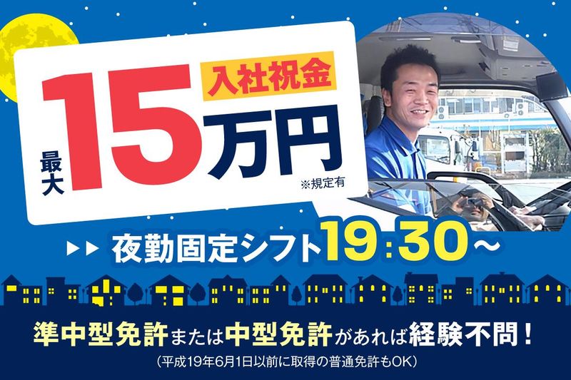 仕事内容 【普通免許があればOK!】 業務に必要な中型免許の取得は 会社がサポート! 取得費用を一部負担いたします◎ 未経験から安定勤務のチャンス♪ もちろんドライバー経験者も大歓迎! ◆千葉県内のみの地場配送 ◆固定シフトで生活リズム安定 ◆お休み希望は100%通ります! ◆最長1ヶ月の研修で丁寧に指導します! ―――――――――――――――――――― 千葉県内の大手コンビニに 食品や飲料などを配送していただきます。 【車両】3t冷凍冷蔵車 【ルート】8~10店舗の配送を1日2便 ◇長距離ナシ&固定ルート配送なので 体の負担は少なめ。 一度覚えてしまえばラクラクです! ◇普通免許があればスタートできるので、 ドライバーデビューも大歓迎♪♪ 中型免許の取得サポートや、 一人ひとりのスキルに合わせた研修を ご用意しています。 最長1ヶ月かけて丁寧に指導するので、 自信を持ってスタートできますよ! もちろん準中型・中型免許をお持ちの方も 免許や経験を活かしていただけます◎ ◇ドライブレコーダー、バックアイカメラ、 GPS運行管理システムを搭載。 悪天候や工事・事故渋滞などによって トラブルが起きた場合も、 事務所と仲間がスグにサポートします。 ――――*ガッツリ稼げます!*――――― 未経験スタートでも月給34万~40万円! 業績に応じて賞与も支給します。 「頑張っているのに給料が上がらない」 「今より高収入を目指したい」 そんなアナタも満足できるはずです♪ さらに、入社祝い金を最大15万円支給! 入社1ヶ月後と半年後にゲットできるから、 モチベーションもアップしますよ! ―――――*固定シフトで安定*――――― 勤務時間は19時半~翌7時で固定! 生活リズムを崩さずに働けます! その他の時間帯も相談OK◎ 「家族との時間が欲しいから日勤」 「夜勤でしっかり稼ぎたい」など、 ライフスタイルやスケジュールに 合った働き方をご相談ください! ―――*お休みの融通もききます*―――― シフトは2週間毎に決定。 お休みの希望も100%通ります! 先の予定が分からない方も安心です。 お子さんの学校行事にも参加できますし、 推しのライブも気兼ねなく観に行けます! 有給取得率も高いですよ♪ ――――*だから定着率が高い!*―――― 「無理なく自分のペースで働ける環境」を 大事にしている当社。 おかげさまで定着率が高く、 20代~50代という幅広い世代の男女が イキイキと働いています◎ ――――――――――――――――――――