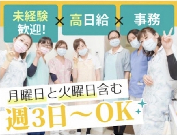 仕事内容 \ この求人のポイント / ⏩ 日給1万3000円の高日給事務 ⏩ 週3日×平日のみで働きやすい ⏩ 残業なし!家庭との両立も◎ ⏩ 訪問歯科レセプト経験を活かせる <ピアス・ネイルOK!未経験歓迎◎> 訪問歯科のレセプト業務を中心に、 院内事務をサポートしてくれる方を 募集しています✨ *-*-*-*-*-*-*-*-*-*-*-*-* ▶お仕事内容  ̄ ̄ ̄ ̄ ̄ ̄ ̄ ̄ 地域の高齢者医療を支える 訪問歯科の事務業務をお任せします。 ■訪問歯科のレセプト業務 ■月次レセプト確定後の請求書作成 ■患者様への請求書発送 ■会計業務の補助 ■コーディネーター急休時の 軽自動車運転(代務) ✨業務は基本的に 院内事務所で行います。 外出業務はほとんどありません! ✨訪問歯科レセプトの経験が 少しでもある方は大歓迎です! ▶こんな役割のお仕事です  ̄ ̄ ̄ ̄ ̄ ̄ ̄ ̄ ̄ ̄ ̄ ̄ ̄ ̄ 訪問歯科は、 通院が難しい高齢者の方へ 歯科医療を届ける 大切な医療サービスです。 その現場を事務の立場からサポートし、 正確なレセプト処理や請求業務を通して 医療現場をスムーズに運営する 役割を担っていただきます。 約250人の利用者さんがいる 地域の高齢者医療を支える訪問歯科を 一緒に支えてくださる方を お待ちしております◎ *-*-*-*-*-*-*-*-*-*-*-*-*
