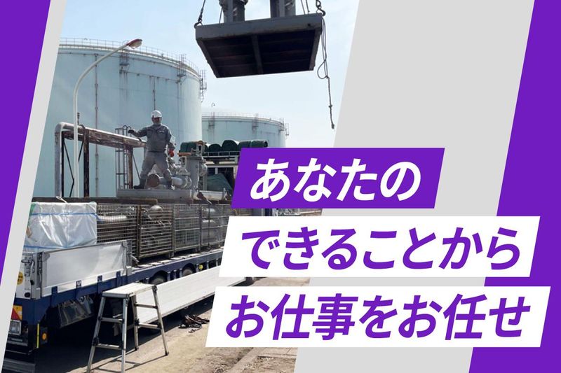 求めている人材 < 現場経験がある方であれば大歓迎 > < 幅広いスキルや資格が活かせます > □■ 応募に必要な条件 ■□ *業界・現場系作業の経験がある方 (職種・年数は不問) *安全意識を持って作業できる方 *チームワークを重視して行動できる方 □■ 歓迎するご経験・資格 ■□ *玉掛け技能講習修了者 *ユニック車運転経験者 (小型移動式クレーンなど) *クレーン運転特別教育修了者 *乙種第4類危険物取扱者 *配管工・洗浄工・設備工の経験者 *大型自動車免許保有者 ※いずれかに当てはまる方は大歓迎! □■ こんな方にピッタリ ■□ ・頑張りを正当に評価されたい ・収入もキャリアも上を目指したい ・後進世代の指導にも関わっていきたい ・少人数の職場環境でテキパキ働きたい 土木作業経験者なども大歓迎! 経験・スキルを活かして 将来は多能工としても活躍いただけるよう 会社としても精一杯フォローします!