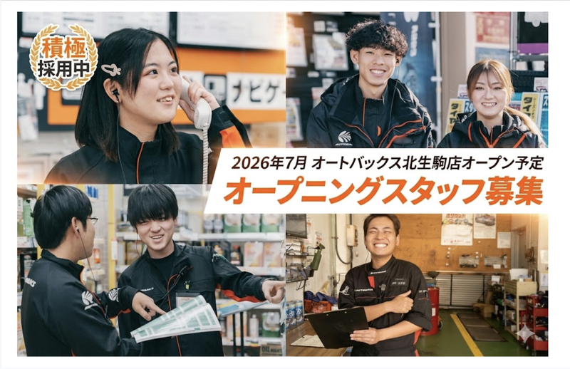 仕事内容 - ✨2026年7月OPEN! ✨オープニングスタッフ募集!! - 2026年7月にオープンする新店舗 「オートバックス生駒店(ヴァンベールモール北生駒内)」にて、 店内の商品管理全般をお任せします。 ピット作業(車両整備補助)ではなく、 売場やバックヤードでの作業が中心です。 <具体的な業務内容> #商品の入荷検品 (届いた商品の数を確認) #売場への陳列、補充( (ピカピカの棚を商品で埋めていく作業です!) #在庫整理、棚卸し (季節に合わせた売場変更のサポート) ★7/1〜9は開店準備期間! お客様がいない店内で、 棚割りに沿って商品を並べたり、 値札を貼ったりと、 お店を完成させる 「裏方」の楽しさを味わえます。 ★事前トレーニングあり!(必須参加ではありません) 5〜6月の間に「外環四條畷店」または 「門真店」にて研修を行います(時給発生・交通費支給) 商品の名前や扱い方を事前に覚えられるので、 未経験の方も安心です。