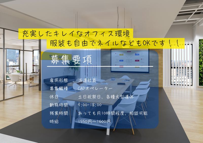 求めている人材 ・AutoCADの経験者 ・Word、Excelの基本スキル *無資格歓迎(資格不問) *学歴不問 *ブランク歓迎 *第二新卒歓迎 *長期歓迎 <活躍中のスタッフ> 男性活躍中・女性活躍中 20代・30代・40代・50代活躍中