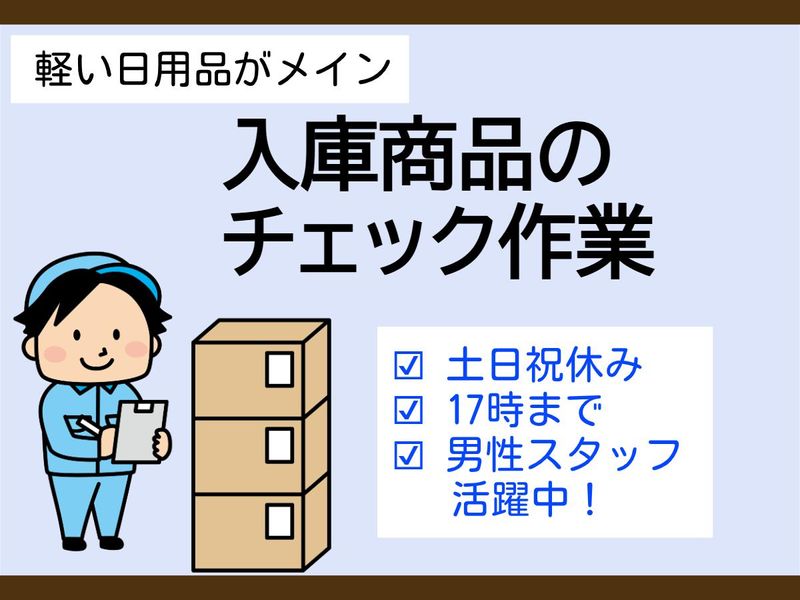 仕事内容 ●○●このお仕事のポイント●○● ☆誰でもできるシンプルな作業 ☆工程も簡単でスグ覚えられる ☆丁寧なフォロー体制があり安心◎ ☆わからないことも聞きやすい雰囲気 ☆弊社スタッフ多数活躍中 ●○●お仕事について●○● マスクや体温計・トイレットペーパーなどの 入庫商品のチェック作業をお任せします! 取り扱う商品は軽い物がメイン! 日常で馴染みのある製品も多数◎ ●○●スタッフインタビュー●○● 長く続けているスタッフが多い印象! 仕事内容もスグ慣れるシンプルな作業で コツコツとこなせます! (スタッフAさん)