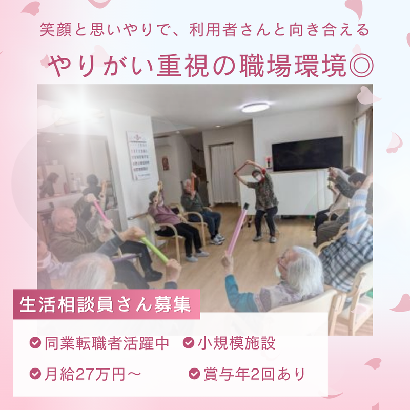 仕事内容 相談受付や援助計画の立案、送迎業務、通所手続補助など 小規模施設なので利用者様との距離も近くコミュニケーションも取りやすい! 大きな施設で流れ作業が辛いと悩んでいたstaffも当施設へ転職後のびのび活躍中! ―――――――――――――――――― 当社は「一歩ずつ、寄り添う介護」を モットーに、ご利用者様一人ひとりの 尊厳を大切にし、心のこもったケアを提供しています。 私たちは、ただ日々の介助を行う のではなく、ご利用者様の人生に 寄り添い、安心と喜びを届けることを使命としています。 介護とは、単なるサポートではなく、 その方らしい生活を支える大切な仕事です。 ご利用者様が笑顔で過ごせることが、 私たちにとってのやりがいとなり、誇りとなります。 当社で勤務してくれているスタッフたちは、 チームワークを大切にしながら、 それぞれの専門性を活かして活躍しています。 介護職は日々のケアを通じてご利用者様の生活を支え、 生活相談員はご家族との橋渡し役となり、 看護師は健康管理を担いながら医療面でのサポートを行います。 当社では、スタッフ一人ひとりが 自分の役割を果たしながら成長し、 より良い介護を提供できる環境を整えています。 ぜひご応募いただく皆さんがのびのび 活躍できる環境をご用意してお待ちしております! ―――――――――――――――――― 平塚駅、大磯駅、茅ヶ崎駅、北茅ヶ崎駅、 香川駅、寒川駅、宮山駅、倉見駅、 門沢橋駅、社家駅、厚木駅、海老名駅、 本厚木駅、愛甲石田駅、伊勢原駅、 鶴巻温泉駅、東海大学前駅、秦野駅 などから通勤するスタッフ活躍中! ――――――――――――――――――