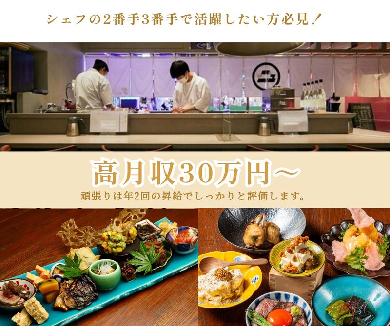 求めている人材 飲食店での勤務経験がある方 (経験:原則正社員での経験を対象とします。) *学歴不問 *2〜3社経験後、シェフの2番手3番手で活躍したい方必見◎ *いきなり正社員は不安...という方は、まずはアルバイトからのスタートもOK! \歓迎します!/ 和食・日本料理経験者 調理師免許をお持ちの方 独立志向がある方 接客業経験がある方 ブランクがある方 長期で働きたい方 スキルアップしたい方 20・30代