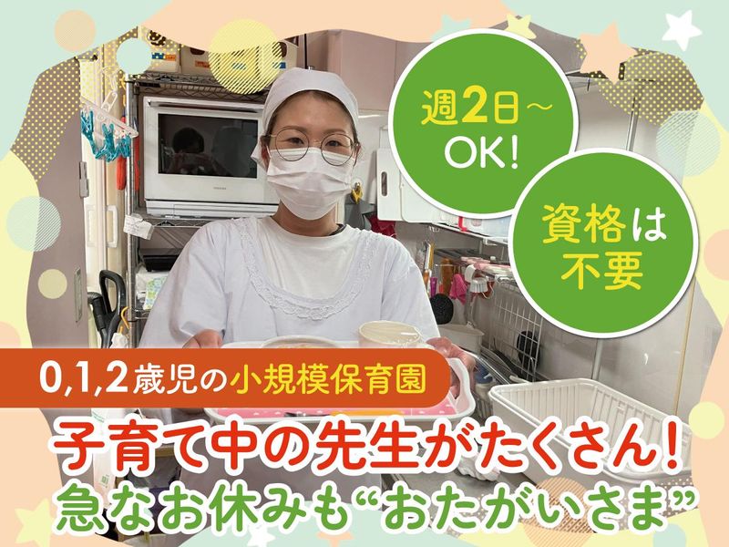 仕事内容 ―――――――――――――――――― ⏩週3日~OK!残業なし! 自分のペースで働けます♪ ⏩うれしい土日祝休み!土曜保育は 弁当をご持参いただくのでお休みです ⏩資格や経験は一切不問◎ 「子どもが好きで」「地元で働きたい」 などキッカケは何でもOKです! ⏩冷蔵庫や電子レンジ有の休憩室完備◎ ゆっくり休めるように別室をご用意! ―――――――――――――――――― ✅お仕事内容 0~2歳児を対象とした 小規模保育園(定員19名)での 給食・おやつ調理をお願いします! <具体的には…> ⭐給食やおやつの調理 ⭐調理室内の清掃や 整理などの衛生管理 ⭐洗い物や材料発注 など! ※基本は2人体制で行います! むずかしい作業はないので、 調理のお仕事がはじめてでも大丈夫◎ スタッフみんなで 「どうしたら園児たちが もっと食べやすいかな?」 と保育スタッフや管理栄養士と 相談しながら、楽しく協力して お仕事しています! ”子どもたちの笑顔のために” そんな気持ちが チーム全体に溢れている職場です。 ―――――――――――――――――― \園児の笑顔が見える、温かい職場✨/ ✅園児の「おいしいね!」がすぐそこに 調理室には小さな窓がついていて、 その向こうには、給食を食べている 園児たちの姿が見えるんです♪ 「おいしい~!」と ニコニコ笑ってくれる園児の声や表情が 調理室までしっかり届くので、 とても温かい気持ちになりますよ◎ 調理室が別の建物にある園もありますが、 ここでは先生や子どもたちと しっかり繋がっている感覚があって 「自分も保育の一員なんだ」と 実感しながら働ける、 やりがいのある環境です! ✅園長先生が温かい♪ 園長先生は園児たちだけでなく、 働く先生や職員たちの事も とても大切にしてくれる方です。 「無理しないでね」「ありがとうね」 そんな優しい言葉をいつもかけてくれます。 この温かさが園の雰囲気にもあらわれていて、 どの職員も自然と笑顔で働いています! 「距離感が近く、園長先生に相談しやすい」 と話す方もいらっしゃいます♪ ✅しっかり休める休憩室あり! 給食を一緒に食べる園も多いですが、 ここの園では『職員専用の休憩室』が 園の隣のマンションに用意されています! 園長先生の 「しっかり職員の方々に休んでほしい」 という想いから設置されたもので、 冷蔵庫や電子レンジも完備♪ 落ち着いた空間で ゆっくりお昼ごはんを食べたり、 仮眠を取ったり…と ちょっと一息ついたりできる、 ありがたい場所です◎