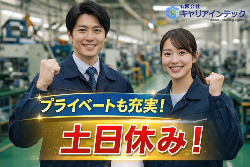 求めている人材 経験、学歴は一切不問です! ※働くに当たって必要な資格なども特にありません。 製造業に挑戦したい方、興味がある方、お待ちしております! ☆おすすめポイント☆ ・土日休みもしっかり取れるのでプライベートとの両立間違いなし! ・お給料の日払い、週払いOKなのでお財布に優しい! ・作業経験・スキルは一切必要ないので未経験からのスタートしやすい! ・社会保険もあるので安心して働けます!
