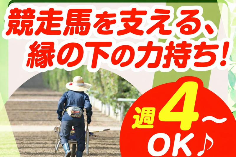 仕事内容 \\ ”レア求人”!馬好きさん必見♪ // 急募!とにかく人が足りません!!!! なので、「10:00~13:00」の ”短時間勤務”のシフトも追加しました✨ Wワークで働きたい方も大歓迎です! 競走馬を支える縁の下の力持ち! 普段は入れないJRA美浦トレセンの中で、 競走馬たちの“快適な環境”を守る仕事です。 一頭一頭の走りを陰で支える “チームの一員”として活躍できます! ╭━━━━━━━╮ この仕事の魅力 ╰v━━━━━━╯ ✅普通では立ち入れない 「JRAトレセン」で働ける! ✅馬や競馬が好きな方にはたまらない環境! ✅一度覚えたら、 あとはコツコツ・モクモク作業! ╭━━━━━━━━╮ 向いているタイプ ╰v━━━━━━━╯ ・動物が好き、馬が好き ・体を動かす仕事がしたい ・決まったルールの中でコツコツ働くのが得意 ・派手さよりも“縁の下の力持ち”にやりがいを感じる - ●具体的には●  ̄ ̄ ̄ ̄ ̄ ̄ ̄ JRA美浦トレーニングセンター内での 『馬糞清掃』のお仕事です。 ◎馬糞清掃 ▶馬道(砂道)に落ちた糞の回収・運搬 (熊手や一輪車を使って清掃を行います) 複数名のチームで清掃を行います。 ※トレセン内では業務車で送迎します。 (自分で運転はしません。) 外での仕事になるので 大変なところもありますが みんなで助け合いながら 作業を行っているので 未経験の方も安心して働ける環境です! 屋外作業なので、 天候に関係なく勤務があります。 (雨の日も、真夏も、冬の寒さも!) また、少し匂いがあったり 汚れたりも多く、体力も使う仕事です。 でもその分、 ========================= 自分がきれいにした馬道を馬が通る光景 には何とも言えない”達成感”があります✨ ========================= 未経験の方も、まずは先輩と一緒に 作業しながら少しずつ慣れていけます。 「大変でも、やりきるタイプ」 の方にぴったりのお仕事です!! ●1日の流れ (例/10:00~16:30勤務の場合) 10時00分 朝礼 10時10分 構外清掃(掃き掃除等) 11時15分 小休憩 11時30分 構内馬道清掃(馬糞拾い) 13時45分 昼休憩 14時45分 構内清掃(掃き掃除等) 15時00分 小休憩 15時15分 構内馬道清掃(馬糞拾い) 16時30分 退勤 実働5時間(休憩1時間30分) ●作業現場までは送迎車(バス等)で移動 ●雨の日や土日・祝日は手当あり ●作業人数が少ない日も手当あり ●残業は基本的にありません ※勤務時間は競走馬の 調教時間などで多少前後します。