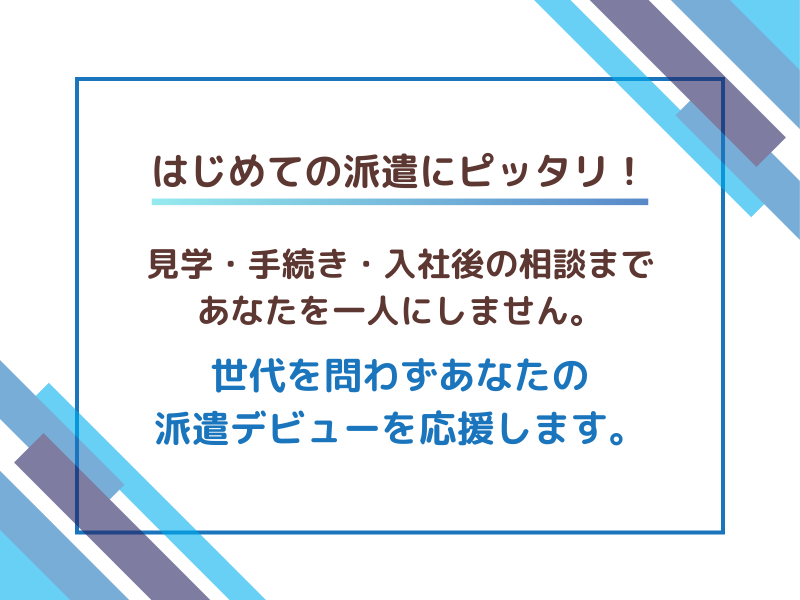 職場環境 ブランク・経験がない方もOK! 資格を活かして安心リスタート。 安定した環境のため、 長年働ける現場です。 職場見学や手続きは担当者が同席し、 入社後も交渉・相談をサポート。 派遣デビューも不安なく始められます。