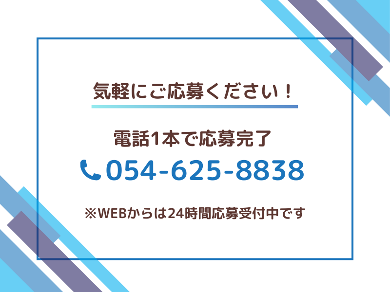 選考プロセス ▼ ご応募はこちら 電話応募:☎054-625-8838 WEB応募:24時間受付中(約1分で入力完了) ■WEBの場合、応募を確認後に こちらからご連絡します ■面接日・入社時期は相談可能です ■職場見学をしてから入社を決められます 「まずは話だけ聞きたい」 「質問してから決めたい」 という方も大丈夫です。 いきなり入社を決める必要はありません。 まずは職場を見て「自分に合いそうか」を 確認してから判断できます。