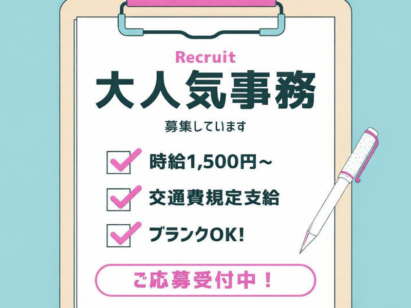 【アピールメッセージ】 未経験からスタートできる事務職で、新たな一歩を踏み出しませんか。 安定した物流業界で、データ入力や事務サポートをお任せします。年間休日120日以上、土日休みでプライベートも充実。ブランクがある方や学歴不問の方も大歓迎です。職場見学も可能なので、実際の雰囲気を見てから安心してご応募いただけます。 あなたの新しいキャリアがここから始まります!私たちは未経験者を歓迎する事務職を募集しています。年間休日はなんと120日以上!プライベートを大切にしながら、充実した毎日を送りませんか? 【年間休日120日以上】 仕事とプライベートの両立が可能で、心に余裕を持った生活ができる環境です。しっかりと休息をとりながら、自分のペースで働けます。 【土日休み】 土日がお休みなので、家族や友人との時間も大切にできます。趣味や学びの時間を大切にしたい方には最適な職場です。 【車通勤可能】 通勤に便利な車通勤が可能で、駐車場も完備。自分のライフスタイルに合わせた通勤ができます。バイク通勤もOKなので、通いやすさを重視する方にもぴったりです。 私たちは、学歴不問でブランクのある方や未経験の方も大歓迎。多様なバックグラウンドを持つ仲間が集まり、互いに助け合いながら成長できる環境が整っています。 髪型や髪色、ネイル、ピアスも自由なので、自分らしさを大切にしながら働けます。週払いも可能で、急な出費にも対応しやすいのも魅力の一つです。 職場見学も可能なので、実際の雰囲気を感じてから応募することができます。まずはお気軽にお問い合わせください。 私たちと一緒に新しい挑戦を始めましょう!あなたのご応募をお待ちしております。