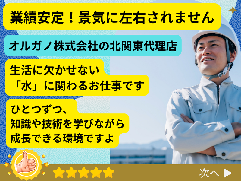 仕事内容 ー【お仕事内容】ー 【既存のお取引先のフォローがメイン】 *お客様が納入済の水処理装置の 保守・メンテナンス・顧客サポート *業務の8割は保守・メンテナンス、 2割が顧客サポート(フォロー営業) になります。 *基本的には屋内での作業になります。 *メンテナンスの内容によっては 協力業者さんのサポートもあり。 ー ー【安心ポイント】ー *未経験の方も段階を踏んで、 イチから丁寧に教えます。 *入社後は先輩の同行があるので 安心してスタートできますよ。 【勤務開始日は相談に応じます】 【5月、6月からの勤務もOK】 【現在、在職中の方もご相談下さい】 ー ー【こんな事ありませんか】ー 〇現在の会社や業界の将来が不安・・・  ̄ ̄ ̄ ̄ ̄ ̄ ̄ ̄ ̄ ̄ ̄ ̄ ̄ ̄ ̄ ̄ ̄ ̄ 〇仕事も大切だけど、家族との時間や 自分の時間も欲しい・・・  ̄ ̄ ̄ ̄ ̄ ̄ ̄ ̄ ̄ ̄ ̄ ̄ ̄ ̄ ̄ ̄ 【その不安を消し去り、希望を現実に】 関東三英なら 〇景気に左右されません! 業績が安定した取引先なので安心  ̄ ̄ ̄ ̄ ̄ ̄ ̄ ̄ ̄ ̄ ̄ ̄ ̄ ̄ ̄ ̄ 〇給与は前職や年齢も考慮  ̄ ̄ ̄ ̄ ̄ ̄ ̄ ̄ ̄ ̄ ̄ ̄ 〇充実の家族手当あり 【配偶者2万円/子供一人1万6000円】  ̄ ̄ ̄ ̄ ̄ ̄ ̄ ̄ ̄ ̄ ̄ ̄ ̄ ̄ ̄ ̄ ̄ 〇【定期昇給】や【賞与年2回】など 福利厚生も充実!  ̄ ̄ ̄ ̄ ̄ ̄ ̄ ̄ ̄ ̄ ̄ ̄ ̄ ̄ ̄ ̄ ̄ 〇土日祝&大型連休でプライベートも充実  ̄ ̄ ̄ ̄ ̄ ̄ ̄ ̄ ̄ ̄ ̄ ̄ ̄ ̄ ̄ ̄ ̄ ̄ ̄ 〇社用車での通勤OKです!  ̄ ̄ ̄ ̄ ̄ ̄ ̄ ̄ ̄ ̄ ̄ ̄ ̄ 上記のおすすめポイントがあり あなたの希望に添える会社だと 思っています。 是非、当社で新しい1歩を 踏み出してみませんか。 /////////////////////////////// 勤務地:前橋営業所 (群馬県前橋市元総社町92-5) 担当エリア/群馬県内がメイン ///////////////////////////////