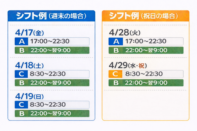 勤務時間詳細 実働時間:1日あたり10時間 平均勤務日数:1ヶ月あたり3日 〜 8日 22:00~翌9:00/休憩1h ●(金)(土)(日)もしくは祝日のみ ●週1~2日勤務 ●残業なし