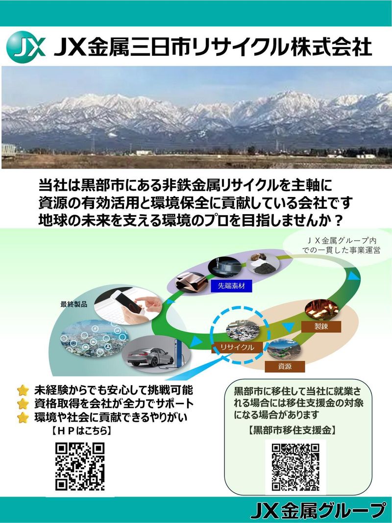 仕事内容 ✨ JX金属グループの盤石な基盤 ✨ 転勤なしで腰を据えて働く ✨ 現場第一を支える手厚い福利厚生 ✨ 専門性を高める資格支援 国家資格取得を奨励金でバックアップ ==================== ■ 私たちの事業 ==================== 当社は非鉄金属リサイクルを主軸に、 資源の有効活用と環境保全に 貢献している会社です。 国内有数の非鉄金属メーカーである JX金属グループの一員として、 盤石な経営基盤のもと、 富山県黒部市の地で長年にわたり 事業を展開してきました。 リサイクルという事業の性質上、 社会的意義の大きな仕事に携わりながら、 安定した環境でキャリアを積むことが できるのが当社の大きな魅力です。 今回は、会社の根幹を支える 総務・経理ポジションの仲間を 新たに募集することになりました。 経理のプロフェッショナルとして、 また総務のゼネラリストとして、 幅広い業務に挑戦できる環境が ここにあります。 ==================== ■ 具体的な仕事内容 ==================== ●総務全般 ・庶務、福利厚生管理業務 ・請負業者業務調整窓口 ・各種監査対応 (ISO、税務監査 他) ・各種会社行事対応等 ・在庫管理業務 月1回程度 (15kg前後の重量物を持つ場合あり、 フォークリフト運転あり) ・資材購買業務 (発注・検収・支払など) ・DXを含めたシステムの導入、 運用管理業務 ●給与勤怠・人事 ・給与、勤怠管理 ・人事関係対応 (各種書類作成、申請他) ・社会保険関係全般 ・人材育成、教育関係業務 総務業務に幅広く携わることで、 会社全体の運営を内側から支える やりがいのあるポジションです。 ==================== ■ このポジションの魅力 ==================== ●資格取得を会社が全力バックアップ 入社後から、フォークリフト運転資格を 含む各種資格取得の補助制度があります。 国家資格の場合は奨励金の支給制度も 用意されているため、 積極的にスキルアップに取り組める 環境が整っています。 ●福利厚生で毎日快適に 社員の作業服は専任の作業員が 会社内で洗濯します。 ●転勤なしで腰を据えて働ける 勤務地は富山県黒部市の事業所のみ。 転勤の心配なく、地元でじっくりと キャリアを積み上げることができます。 ●やりがいと使命感を持って続けられる 業務をこなすたびに知識や経験、 自分で考える力が身に付いていきます。 専門性を高めながら、 会社の経営を支えるという 大きな使命感とやりがいを 持って働き続けられる仕事です。 =================== ■ 職場の雰囲気 =================== JX金属グループという大きな組織の 安心感を持ちながらも、 一人ひとりの顔が見える規模感で 働けるのが当社の特徴です。 総務・経理という立場から、 現場スタッフとも密に連携しながら、 会社全体を支えていく仕事です。 賞与は昨年度実績で6.73ヶ月分と 非常に充実しており、 頑張りがしっかりと報われる 職場環境が整っています。 あいの風とやま鉄道・黒部駅から 徒歩10分というアクセスの良さも 魅力のひとつです。
