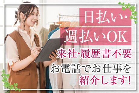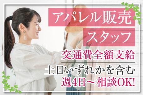仕事内容 ■ショッピングモール内にあるアパレルショップでの接客販売 大人の女性が自分らしくコーディネートを楽しめる シーンを選ばないベーシックなデザインが人気の アパレルブランドで接客・販売をお願いします。 ※具体的には… ・店頭での接客 ・お会計 ・商品管理や品出し ・売場ディスプレイ ・店内の清掃 ・閉店作業(レジ清算、清掃など) など ■おしゃれが好きな方必見!好きなものに囲まれて仕事ができる 特別な資格や経験必要なし! 販売経験を活かしたい! という方はもちろん、未経験の方も大歓迎! 接客のお仕事なので、 知って損はないマナーや 丁寧な振る舞いも身につけることができますよ! 「積極的にお客様に声をかけることに抵抗がない」 「コミュニケーションを大切にしたい」 という方にオススメです♪ ■20代~40代の女性活躍中!週4日~OKなので家庭と両立できる♪ フリーターさんはもちろん、 子育てがひと段落した方や 家事育児と両立して頑張る方が多数活躍中! 私生活と両立しやすいシフトで無理なく働くことができます。 「すぐにお仕事を始めたい」 「長期で安定して働きたい」 「お仕事復帰なので週4日勤務で慣らしていきたい」 「週5日のフルタイム勤務希望」 そんな方にピッタリのお仕事です! ■来社&履歴書不要!電話でお仕事のご紹介が可能です。 応募後、まずはこちらから電話でご連絡いたします。 その際にご都合が良い日時をお伝えいただければ その日時に改めて電話で連絡いたします。 家事の合間や仕事が休みの日など、 あなたの都合のよいタイミングをお伝え下さい。 お電話で業務内容の説明やあなたの希望をおうかがいしたうえで 希望のお仕事をご案内いたします。