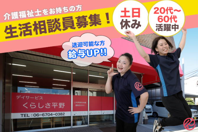 PRコメント \\元気な介護は、働くあなたも元気に!// 【資格取得を応援】 資格取得費用は弊社が負担!研修は出勤日に実施。 《資格取得実績:実務者研修26名(2023年度)》 【あなたのやる気をしっかり評価】 当社の評価制度であなたの活躍を正当に評価! 1年後の評価次第で月給10,000円UPも目指せる! 《昇格者実績:40名(2023年度)》 【こんな福利厚生も!】 職員満足度・人気No.1『元気チャージ月間』 身だしなみや健康面にかかる費用を年間20,000円分当社がサポート! 【有給消化でプライベートも充実】 当社の有給取得率は『86.0%(2023年度)』 有給休暇が取得しやすい環境でプライベートも充実! 【多様な働き方を導入】 事業所によって週休3日制(週4日勤務の正社員雇用)を導入! あなたが希望する働き方の選択が可能! 【仕事内容】 デイサービスに通われる、ご利用者さまやご家族さまと施設の調整や手続き・地域やその他コミュニティとの連携を行っていただくお仕事です。また、介護のお仕事も兼務していただきますので、ご利用者さまの介護業務全般も行っていただきます。送迎業務は必須ではありませんが、お手伝いいただける方は大歓迎です。 ■入社後、仕事内容が変更となる予定はございません。