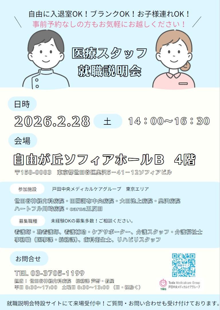 仕事内容 / 戸田中央メディカルケアグループ 東京エリアの医療スタッフ 【 ✨就職説明会✨ 】開催! \ ✅ 予約不要 ✅ 参加費無料 ✅ 入退場自由 ✅ 履歴書不要 ――――――――――――――――― 【日時】2026年2月28日(土) 【時間】14:00~16:30 【場所】自由が丘ソフィアホール4階 └ 東急東横線 自由が丘駅 徒歩3分 ――――――――――――――――― ☟詳細はこちらから! ▶https://www.tmggroup.info/ 【 募集職種 】 □ 看護師 □ 准看護師 □ 介護士 □ 介護福祉士 □ ケアサポーター □ 歯科衛生士 □ 事務(医事課) □ 事務(総務) など < 参加医療機関 > ■ 奥沢病院 ■ 大田池上病院 ■ 田園調布中央病院 ■ 世田谷神経内科病院 ■ ハートフル川崎病院 ■ carna五反田 ~*~*~*~*~*~*~*~ 【お仕事内容】 ● 各種書類の作成 ● 勤怠や給与の管理 ● 社会保険手続きなど、人事関連業務 【戸田メディカルケアグループ】 TMGは一都四県下に29の病院と 6つの老人保健施設、 1つの特別養護老人ホームほか、 クリニック、健診センター、 訪問看護ステーションなど、 合計121カ所(25年8月1日現在) の関連事業所を展開。 首都圏の各エリアで、 医療・介護・保健・福祉を担う トータルヘルスケアネットワーク を形成しています。 グループの医療機関・施設では、 現在16,489名(2025年11月末) の職員が働いています。 【 carna五反田って…? 】 五反田駅から徒歩15分 落ち着いた職場で 長く働ける環境が整っています。 ▶https://www.carna-gotanda.jp/