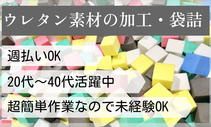 仕事内容 ウレタン素材の加工・袋詰め スポンジみたいな素材を機械にセット、 また出来上がった製品の袋詰めをお願いします。 < おすすめポイント > ・簡単作業なので未経験OK ・土日休み ・工場見学OK ・残業少なめ < 仕事の詳細 > ウレタン素材の加工がメイン作業です。 ・機械にセットし、ボタンを押す ・仕上がった製品の袋詰め作業 上記内容を繰り返し行って頂きます < 職場環境 > こちらの工場では20代・30代・40代の 幅広い年齢の男女が活躍しております! 皆さん和気アイアイと楽しく働いております! 体力に自信がない方でも、 無理なく働くことができますよ。 < 未経験の方も活躍できます > 工場勤務が初めての方も、 カンタン作業からスタートなので安心! 周りの人たちが丁寧に教えてくれますので 安心してお仕事できます。 もちろん、 ・製造工場での勤務経験 ・マシンオペレーター経験 ・製品加工や袋詰めなどの経験 ・検品や袋詰めなどの軽作業 などがあれば即戦力として 活躍いただけます! < 職場見学できます > 実際に職場の雰囲気を体感してみて、 働くイメージが沸いたら応募、 というのもOKです。 まずはお気軽にお問い合わせください。
