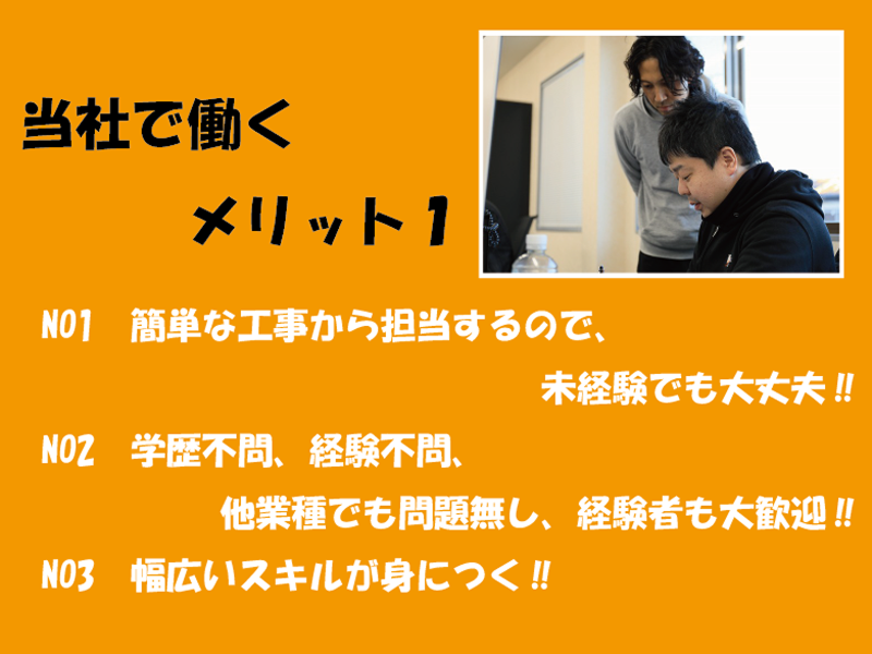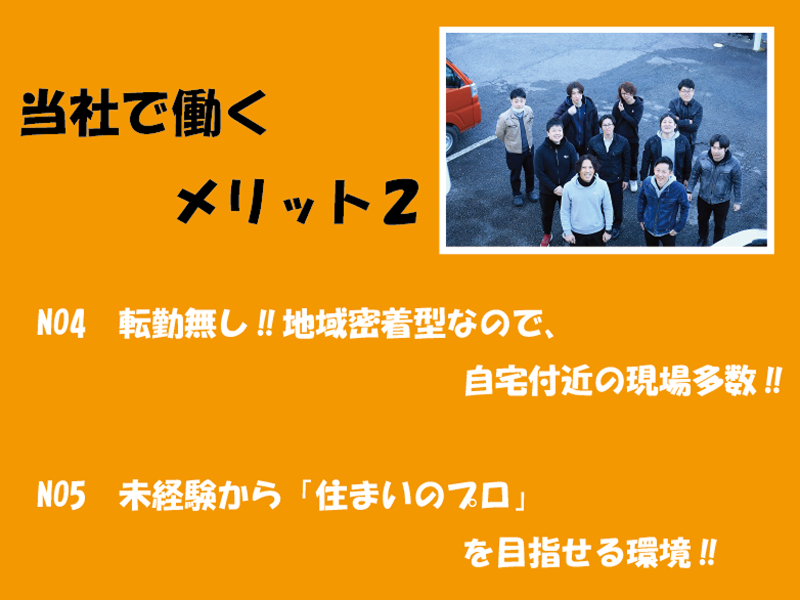 求める人材: 【学問不問/未経験歓迎】 安定した環境で長く働きたい方&手に職をつけたい方 ※不動産業界の経験・知識は不要です。 (先輩たちの8割以上が未経験スタート!) 【必須条件】 ■普通自動車免許(AT限定OK) \こんな方にぴったりです/ ■住宅や建築に興味がある (知識や経験は問いません!) ■DIYなど、手を動かすことが好き ■チームワークや仲間を大切にできる ■ゆくゆくは独立にも興味がある 【こんな経験があれば活かせます!】※必須ではありません ■不動産業界の経験 (不動産管理、メンテナンスなどの経験も活かせます) ■施工管理の経験 ■営業や販売・接客など人と接する業務の経験