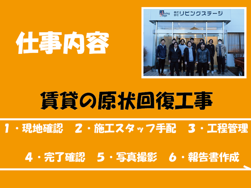 仕事内容: \同世代が多く、未経験でも安心!/ 賃貸物件の退去後のお部屋をチェックして、必要な工事を手配するお仕事です。 ノルマは一切なし!確認作業からスタートするので安心です。 さらに、完全週休二日制&有給も自由に取得できるので、プライベートも大切にしながら働けます。 ■具体的な仕事内容■ マンションやアパートなどにお住いの方が退去した後の、お部屋のチェックや原状回復工事の手配をお任せします! ▼退去状態の確認 退去後のお部屋を訪問し、汚れやキズをチェック、写真撮影 ▼見積作成 工事に必要な材料などを計算し、見積書を作成 ▼工事の手配・管理 受注したら、工事担当へ発注。進捗を管理します。 (※工事作業は別のスタッフが行います) ▼完了確認・報告書作成 工事完了後、不備がないか最終チェック (※1日あたり3~5件の現場を回ります) ■入社後の流れ■ ▼入社後~1か月目 最低でも1か月間、先輩に同行し、仕事の流れを覚えていただきます。 ▼2か月目~ 先輩にチェックしてもらいながら、簡単な業務から実際に取り組んでみましょう! ▼入社後半年~ 半年を目途に独り立ち!業務に慣れたら、直行直帰など柔軟な働き方が可能になります! ■当社について■ マンション・アパートにお住まいの方が退去した後の”原状回復工事”を手掛ける当社。不動産の管理会社さまから依頼を受け、退去後のお部屋の状況確認や工事の手配を行っております。継続的な依頼を数多くいただいており、業績は好調です。
