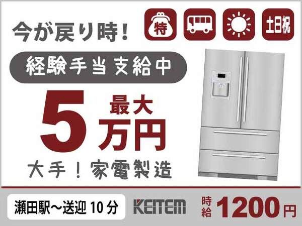 仕事内容 【冷蔵庫の部品取り付け・目視チェック】 家電製品を作る、大手家電メーカーの工場でのお仕事です。 以下のいずれかの配属先で作業をお願いします。 ▼仕事詳細 <メインライン> (1)手のひらサイズの部品を本体へ取り付け (2)ドライバー等を使って本体へビス留め (3)引出しの開閉をチェック (4)冷蔵庫が正常に動くか通電のチェック (5)出荷前の本体へ説明書等の取り付け (6)最終検査・目視チェック <部品製造> (1)機械に部品をセット (2)ボタンをポチッと押して加工 (3)取り出してドア本体へ取り付け (4)材料を台車で運搬 <物流> ★フォークリフトの資格をお持ちの方にお願いします。 (1)フォークリフトで製品の運搬 (2)ピッキング 【求人担当者からヒトコト】 働き慣れた環境で、もう一度…! 「初めての現場は不安…」という心配も不要。 すでに経験のある方はすぐに活躍していただけます。 ・。'.・。'.・。'.・。'.・。'.・。'.・。'.・。 ◆ おすすめポイント ◆  ̄ ̄ ̄ ̄ ̄ ̄ ̄ ̄ ̄ ̄ ̄ ̄ ̄ 【冷蔵庫の部品取り付け・目視チェック】 『今が戻り時!\経験者限定!最大5万円の特別手当あり!/』 #あの大手家電メーカーの冷蔵庫ライン #20~50代活躍中 #送迎バス有 #日勤 #土日祝休み #ネジ締め・検査 #日払い可 ・。'.・。'.・。'.・。'.・。'.・。'.・。'.・。 ◆ 職場環境について ◆  ̄ ̄ ̄ ̄ ̄ ̄ ̄ ̄ ̄ ̄ ̄ ̄ ̄ ▽働くスタッフさん 就労経験があれば即戦力! しっかり手当で還元します。 もちろん初めての方も大歓迎! 性別問わず20代~50代後半の方まで 幅広く活躍中の職場です。 ・。'.・。'.・。'.・。'.・。'.・。'.・。'.・。 ◆ 採用担当よりPR ◆  ̄ ̄ ̄ ̄ ̄ ̄ ̄ ̄ ̄ ̄ ̄ ̄ ̄ (1)この機会に帰ってきてください!経験がちゃんと“手当”になります! (2)日勤シフト&土日祝休みでプライベートにも余裕あり! (3)カップル・お友達同士の応募も大歓迎!一緒に楽しくオシゴトOK ・。'.・。'.・。'.・。'.・。'.・。'.・。'.・。 ◆ 業界未経験者大歓迎 ◆  ̄ ̄ ̄ ̄ ̄ ̄ ̄ ̄ ̄ ̄ ̄ ̄ ̄ 以下の業界での勤務経験のある方も活躍中! ・自動車整備業界 ・物流・運輸業界 ・飲食業界 ・小売業界 ・サービス業界 ・アミューズメント業界 ・インフラ業界 ・ホテル業界 etc. ・。'.・。'.・。'.・。'.・。'.・。'.・。'.・。