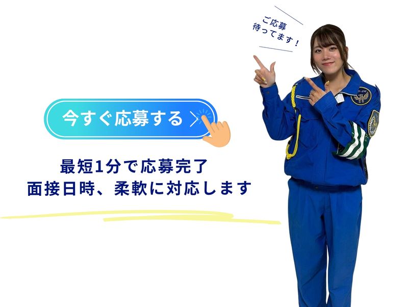 求める人材: ・18歳以上(警備業法) ・学歴不問/中卒・高卒・高校中退もOK! ・アルバイト・パート・派遣・契約社員だった方も歓迎 ・副業OK・Wワーク歓迎/ ・フリーター・主婦(夫)・シニア活躍中! ・未経験OK・初心者OK・ブランク歓迎・無資格歓迎! ・扶養内歓迎!ブランク歓迎!扶養内勤務歓迎! ・年齢不問/10代・20代・30代・40代・50代・60代・70代活躍中!ミドル・中高年活躍中 <下記に当てはまる方は大歓迎> ・警備員として交通誘導の経験がある方 (交通誘導警備業務検定2級をお持ちの方も!) ・ハローワークで正社員の仕事をお探しの方も歓迎! ・元ドライバーや土木作業員の方も活躍中!社員登用実績あり! <他、お仕事ではこんな働き方が可能> ・「週4日以上OK」「平日のみOK」 「残業月20時間以内」など、ご希望に合った働き方ができる! ・「残業ほとんどなし」「高時給(高収入)で稼げる」「シフト自由」など、 あなたのご希望をぜひお聞かせください! ・その他「シフト制勤務」「日勤専属」「夜間アルバイトや深夜バイトの夜勤」「常駐警備」など、 希望には最大限柔軟にお応えします。 ・また「長期休暇あり」「フルタイム歓迎」でもあります! <必要なのは意欲のみ!> ・充実の研修制度あり!未経験者歓迎(実務経験不問) ・ブランク歓迎の積極募集です! ・曜日が選べる・シフト自由な働きかた、 ・駅チカ・駅ナカの勤務地がもあり、 ・転勤なしなので安心・快適に働けますよ。 ・他、スキルアップ・キャリアアップを目指す経験者も歓迎。 ・高時給・高収入の仕事や週4日以上OKの仕事でしっかり稼ぎたい方もご相談ください。 ・60歳以上や65歳以上、70歳以上も活躍中!