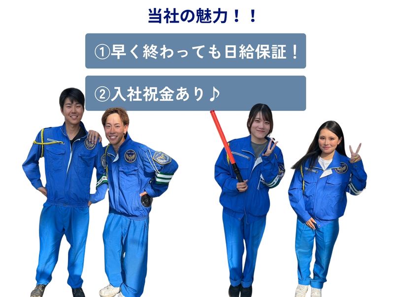 仕事内容: オープニングスタッフ増員募集!! ・新オフィス開設に伴い、スタッフ大募集! ・応募は60秒で完了!スマホだけでOK! 30年にわたり地域に根差して公共・民間工事を手がけてきた弊社。 実績と信頼から、年間を通じて閑散期が無いほどのご依頼をいただいています! ご依頼の件数は更に増加中!今後の業務拡大に備え、体制強化のため 警備スタッフの増員募集を行います!! ・<未経験歓迎>交通誘導スタッフ大量募集! ・<短期の相談OK>短期勤務相談OK!副業OK/WワークOK! ・<入社祝金あり>60勤務終了後の給料に50,000円支給 ・<面接時履歴書不要>人柄採用となります! ・<希望シフト制>1週間毎の希望シフト※事前の曜日固定も可能 ・<運転手当あり>運転免許所持者優遇! ・<見た目自由>髪色や髪型、ピアスもOK⭐︎ ・友達と一緒でのご応募も大歓迎! ・シフトの申請や確認はスマホで完結するから楽々⭐︎ ⭐︎電話でのお問い合わせ⭐︎ 080-4422-8202まで 「求人を見た」とお問い合わせください⭐︎ ⭐︎仕事内容について⭐︎ 交通誘導をお任せ 工事現場や駐車場での車両・歩行者の 交通誘導やご案内などのお仕事です。 <具体的な仕事内容> ■車両誘導 …片側車線が工事している場合などに もう片方の車線に誘導します。 ■歩行者誘導(車両や歩行者) …「こちらをお通りください!」のように 車両や歩行者を誘導します。 ■案内業務 …ドライバーに対して迂回路の案内 ※他、イベントでの誘導等 <勤務地> 四條畷市、寝屋川市、門真市、交野市、枚方市、生駒市、大東市、守口市エリアで交通誘導 他、大阪市内や東大阪、八尾、吹田、高槻にも現場あり! ※直行直帰勤務の為、事務所に出勤する必要なし! ※車・バイク通勤OK <未経験者も大歓迎> チーム体制で働きますので、ご安心ください! 難しいことは一切ありません 警備の経験がない方でも 安心してスタートしていただけます! <オープニングスタッフ一例> 【スタッフの声】 32歳 Bさん 四條畷市在住 3年ほど交通誘導の経験があり、 その経験を活かすため、 近くの警備会社を探していたところ、 ちょうどオープニング募集を発見し応募しました。 入社からお仕事も途切れず、日払いも活用し、 安定した生活を送っています。 73歳 Cさん 大阪市在住 他にも応募をしましたが、 未経験な事や年齢で断られることが多く。 不安な中応募しましたが、快く採用していただき、 研修も丁寧で、今はもう業務にも入っております。 全てスムーズに動いていただき感謝しています! 22歳 Aさん 枚方市在住 就職も決まり、授業も無いので、 がっつり働ける仕事を探していたところ、 このお仕事を見つけました。 できればすぐに業務に就きたいと希望を伝えると、 翌日に面接、研修も近日に行っていただきました。 働き方やシフト等、親身にお聞きいただけるのでとてもありがたいです。 また、同世代の20代が一番多いので、楽しみながら働けています。 25歳 Dさん 寝屋川市在住 効率よく稼げる仕事を探していたのですが、 働いてみると思ったより勤務が早く終わる事もありびっくりしました。 日給保証とのことなので1日分のお給料もいただけますし、 前払いも活用していいとのことなのでありがたく思っております。 女性でも働けるとのことで最初は本当か不安でしたが、 働いてみると女性の先輩方も優しく、 働きやすくて安心しました。 ★弊社企業ページもぜひご覧ください★ \企業ページでわかること/ 職場の写真、社員の声、職場の雰囲気、ニュース・最新情報など 弊社で働くイメージがわきやすくなる内容になっています! ※PCでご覧の方は求人票の企業名をクリック ※スマホの方は、クチコミページから「孝栄産業」で検索! <よくあるご質問> ①繁忙期や閑散期があり、閑散期になると、 働きたいのに働けないスタッフが出てきたりしますか? ↓ 弊社では、民間工事・公共工事含め、年間のお仕事のご依頼量は安定しておりますので、 今後もスタッフのご希望に応じたシフトで働いていただくことが可能となっています。 ②前払い制度(日払い等)は毎回事務所へ行けばいいですか? ↓ 前払い専用のカードをお渡ししますので、 24時間365日お近くのATMをご利用いただくことが可能です。 ※ご自身の口座を作成する必要はございません。 ③昇給はどのようなタイミングで行われますか? ↓ 弊社では3か月に1回、年4回のスタッフ評価制度を設けております。 業務スキルだけではなく、勤務日数や業務に取り組む姿勢などをまとめて評価しております。 中には半年で給与が800円UPした方もいらっしゃいます。