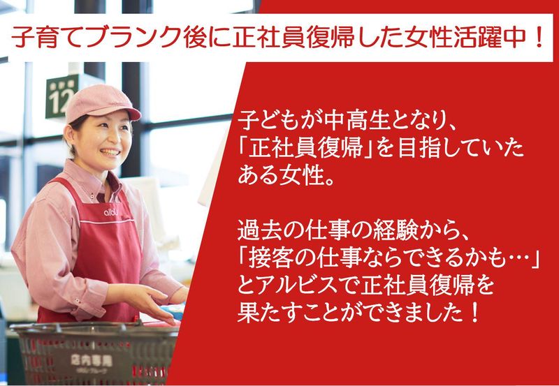 【保険制度】 雇用保険、労災保険、健康保険、厚生年金 待遇・福利厚生 【福利厚生】 <奨学金返済支援制度> 一定の条件を満たすことで、奨学金の月々の返済額の一部を補助します。 <社内預金> アルビス社員に特別な年率保証がされている嬉しい制度です。 <社員持株会> プライム上場企業ならではの制度、少額の投資で自社株を購入することが出来ます。 <社宅制度> 転居を伴う異動があった場合に利用します。契約金、毎月の家賃はもちろん会社負担です。 <お買い物金額割戻制度> 店舗でお買い物した金額の5%を翌々月に割戻します。 <GLTD制度(長期収入補償制度)> 病気やケガが原因で長期間仕事ができない場合に、在籍中・退職後を問わず、 最長で満65歳まで、収入の一定割合を補償する制度です。 <保養施設> エクシブ軽井沢に年2回まで従業員特別価格にて宿泊できます。 ※その他、確定拠出年金制度、団体総合定期福祉保険制度、各種慶弔金制度、社会保険完備 など ✅社員インタビュー! =================== Q:なぜアルビスを選んだのですか? =================== ✨<Aさん(女性/30代)> 高校卒業後、飲食店・旅館で働いてましたが、早くに結婚をし2人の子育てのために、しばらく仕事を離れていました。 30代後半、家計のためにも「正社員復帰したい」と思いお仕事探しを開始。 接客の仕事に興味があったので、アルビスへの入社を決意しました! 持ち前のコミュニケーション力を活かして頑張っています♪ ✨<Bさん(男性/20代)> 高校卒業後に入った会社が工場勤務でしたが、 通勤途中のアルビスで新鮮な海産物や 惣菜に惹かれ、地域の食文化を支えたいと感じました。 スタッフの温かい対応や良好なチームの雰囲気に惹かれ、地域に喜ばれる商品を提供したいと思い、アルビスに転職しました。 お客様と直接会話し、直接感謝されるので モチベーションが上がる仕事です! ✨<Cさん(女性/20代)> 初めてアルビスを訪れた際、 食品へのこだわりや清潔感に感心し、 社員説明会で女性が働きやすい環境やキャリア重視の姿勢に惹かれ、 入社を決意しました。 整ったマニュアルや研修のおかげで 働きやすさを実感しています。 また、お魚を捌いたり、食材を使った調理に挑戦できるので、将来に役立つ技術も身に付きますよ。