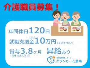 インフォメーション 就職支援金あり☆新しいキレイな施設・通勤便利◎/育児休業からの復帰率ほぼ100%/年間休日120日「グランカーム黒埼」 医療法人社団 晴和会(新潟市)は、1998年に産科婦人科クリニックから始まり、療養型病院、介護老人保健施設、通所リハビリ、居宅介護支援事業所、訪問看護・訪問介護ステーション、住宅型有料老人ホーム、保育園など、多彩な医療・介護・子育て支援サービスを地域に提供する包括的な医療法人です。 少子化・超高齢化が進む中、「患者様・入所者様・利用者様・ご家族様が望まれるもの」を追求する姿勢を大切にし、地域医療と在宅介護の両方に貢献しています。 働きやすい環境を整えるため、子育て支援「くるみんマーク」取得や定年年齢65歳をいち早く導入。介護職を安心して志す方のため、奨学金制度や資格取得奨励制度などのキャリア支援制度などもあります。 またグランカーム黒埼介護職の場合、最大10万円の就職支援金制度があり、初めての方やブランクのある方でも安心しやすい環境です ! アピールポイント ◎ここがポイント! 2024.2月オープン♪きれいな施設 子育て世代応援「くるみん」取得法人 定年は65歳で長~く働ける 賞与3.8ヶ月(前年度法人実績) 給与改定年1回あり 土日祝、皆勤、住宅、資格など手当充実 無料駐車場あり、車でらくらく通勤
