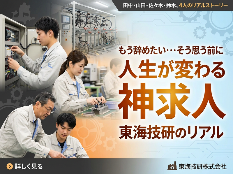 仕事内容 東海技研株式会社のB面情報 より多様な社員の「リアル」を見せる 【事例1】入社3年目・田中雄一さん (29歳・元保険営業)のリアル 「正直、最初は電気図面が 読めませんでした。 『PLC』って何?『リレー』って何? 状態で。前職は保険営業だったので、 技術的なことは本当に初心者でした。」 田中さんが振り返るのは、 入社初日の衝撃です。 「先輩の鈴木さんが 『最初は誰でもそうだから』って、 昼休みに付きっきりで 教えてくれたんです。 図面の見方から始まって、 『この記号は何を意味するのか』 『なぜこの配線が必要なのか』まで。 鈴木さんって、説明がめちゃくちゃ上手で、 営業時代に『お客様に分かりやすく伝える』 ことを大切にしていた僕にとって、 すごく学びになりました。」 入社半年後、初めて一人で 制御盤の配線を任された日のことを、 田中さんは今でも鮮明に覚えています。 「配線が複雑で、途中で 『もうダメだ』って思ったんです。 でも、鈴木さんが 『一度に全部覚えようとしなくていい。 今日は3本だけ完璧にやろう』 って言ってくれて。 その日は結局、予定の半分しか できなかったんですが、 『今日の3本、すごく丁寧だね。 明日も頼む』って言われて、 なんだか救われました。」 今では制御盤の配線で 「田中に任せておけば安心」と 言われるまでになった田中さん。 転職を後悔したことは一度もないと言います。 「前職では『今月の売上はどうだった?』 という結果しか見られませんでした。 でもここでは、『昨日より今日の方が 配線が早くなったね』 『この改善提案、すごくいいアイデアだ』 って、成長の過程を一緒に喜んでくれる。 それが一番嬉しいです。」 田中さんの「とある月曜日」 (2024年1月15日) 8:50 出社、作業着に着替えながら 今日の予定確認 9:00 朝礼 「今週の納期確認と安全唱和」 9:20 制御盤配線作業開始(集中モード) 10:30 新人の佐々木さんに 配線のコツを説明 12:00 昼食 (同期の山田さんと 「週末の子供の運動会」話) 13:00 午後の配線作業 (BGMは工場の機械音) 15:00 品質チェック (設計の高橋さんと仕様確認) 16:30 明日の作業準備と工具の整理 17:45 退社 (「お疲れ様でした!」の声に送られて) 【事例2】子育て中・山田美香さん (34歳・機械オペレーター)の日常 「17:30に必ず帰れるのが 本当にありがたい。 保育園のお迎えも余裕です。 前の会社では『子供がいるから早く帰る』 って雰囲気が気まずくて...。」 2児の母である山田さんは、 3年前に東海技研に転職しました。 「面接の時に『子供の急な発熱で 休むことがあります』って 正直に話したんです。 そしたら課長が 『うちも子育て世代多いから、 お互い様ですよ』って。 この一言で、ここで働きたいって 思いました。」 山田さんの働き方は、 効率を重視したスタイルです。 「『早く帰るから仕事が中途半端』 なんてことはありません。 むしろ限られた時間で成果を出すために、 無駄をなくし、効率を考えて 作業するようになりました。 結果的に品質も向上したんです。 チームのみんなも協力的で、 17:30になると『お疲れ様! 明日もよろしく!』って 自然に送り出してくれます。」 特に印象的だったのは、 下の子が入院した時のことです。 「突然1週間休むことになったんですが、 田中さんが『家族が一番だから、 気にしないで』って言ってくれて。 復帰した時も、『大変だったね、 子供さんは大丈夫?』って 心配してくれました。 仕事の引き継ぎも完璧にしてくれていて、 本当にありがたかったです。」 山田さんの「とある水曜日」 (保育園参観日) 8:30 子供を保育園に送った後、直接出社 9:00 機械の点検とセットアップ 10:00 部品の品質チェック (不良品1個発見、即座に報告) 11:30 参観日のため早退申請 (「行ってらっしゃい!」の声) 11:45 退社、保育園へ直行 翌日:「参観日はどうでした?」と チーム全員が気にかけてくれる 【事例3】新卒入社2年目・佐々木健太さん (24歳・工学部出身)のリアル 「大学では機械工学を学んでいましたが、 実際のものづくりは全然違いました。 理論と現実のギャップに、 最初は戸惑いましたね。」 新卒で入社した佐々木さんが語るのは、 学校と現場の違いです。 「設計図通りに組み立てても、 なぜか動かない。 『なんで?』って先輩に聞いたら、 『部品の個体差があるから、 現場で微調整が必要なんだよ』 って教えてもらいました。 教科書には書いてない、 現場ならではの知恵ですね。」 最も印象に残っているのは、 初めて一人で製品を完成させた日のことです。 「駐輪ラックの組み立てを任されたんですが、 最後の動作確認で不具合が発生。 どうしても解決できなくて、 泣きそうになりました。 でも、製造部長の川上さんが 『失敗は成長のチャンス』って言いながら、 一緒に原因を探してくれたんです。 結果的に、僕の配線ミスだったんですが、 『この失敗で確実に成長したね』 って褒めてもらえました。」 現在は後輩指導も担当する佐々木さん。
