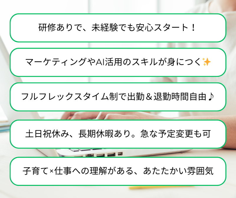 求めている人材 <必須条件> ■大卒以上 ■人材業界での経験(2年以上) もしくは企業での人事採用経験(2年以上) ■自身のPC、イヤホン、無線LAN環境で 仕事ができること <歓迎条件> ■Web広告運用 ■ライター経験 ■Web制作(ディレクターまたはデザイナー)経験 ■Canva、Notion、Slack、 チャットワークなど各種ツールを 入社後に利用できること <こんな方を求めます> ・ポジティブかつ “とりあえずやってみよう”精神の方 ・リモート勤務でも集中力が続く方 ・課題解決が好きな方 ・単純作業だけでなく、将来役立つ スキルを身につけたい方 ・人としての礼儀やマナーが きちんと身についている方 必須条件以外はすべて 満たしていなくても問題ありません。 基本的には現在のスキルよりも やる気や人柄を重視して採用します。