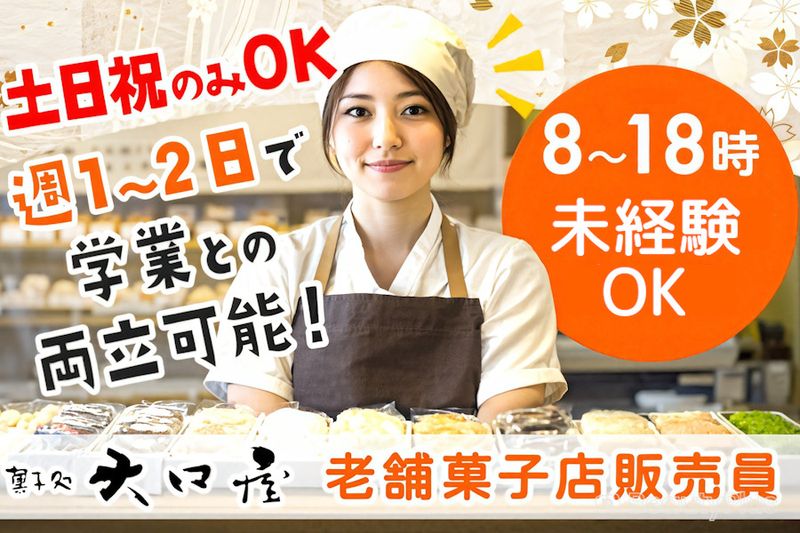 【仕事内容】 \✨️創業200年の老舗菓子店✨️/ 伝統の和菓子を通じ、大切な人へのお土産やお祝い、様々な人生ドラマに寄り添ってきた当店。 実直かつ真面目に業務に取り組むスタッフたちが、当店を一生懸命支えてくれています。 これからもたくさんの人に喜んでいただくため、店舗の顔として接客と販売を担当してくださるスタッフを募集しています。 未経験の方でも先輩スタッフが一から仕事を教えていきますので安心してくださいね。 【大口屋で働くオススメポイント】 ・未経験からでも安心して働けます ・お客様のありがとうが何よりの幸せ! ・創業200年以上の伝統を持つお店での勤務! ■具体的なお仕事内容 多くの観光客や常連客で賑わう当店にて、接客や販売をお任せします。 ・接客対応、レジ業務 ・贈答品の包装や梱包 ・商品の準備や軽作業 ・店内の清掃、電話応対 など ※丁寧なマニュアルや先輩スタッフのサポートがありますので、どうぞご安心ください。 【販売する商品】 餡麩三喜羅(あんぷさんきら)や季節のお菓子などの和菓子を販売しています。 ====================== 心に残るひとときを共に創るお手伝い ====================== 大口屋は文政元年(1818年)創業の和菓子の老舗です。テレビや雑誌など多数のメディアにも掲載され、世代を超えて愛されてきました。 日本文化や季節感を運ぶ和菓子は、人生の節目や季節の彩りとして多くの方に親しまれています。 結婚の挨拶時の手土産などに当店の和菓子を選んでいただき、「緊張感が和らぎ、和やかな空気になりました」と喜びの声が届いたことも。 春は桜もち、夏はわらびもち、秋には秋の実りを用いたものと、季節ならではのお菓子をご用意。 「季節ごとに異なる風味や色彩を、家族と一緒に楽しんできました。素敵な思い出になっています」と嬉しい言葉をいただくこともあります。 一人ひとりの客様に寄り添いながら商品をご案内し、「ありがとう」の声をいただく瞬間に、素敵な思い出作りに貢献できたと感じています。 ============ 週末がご褒美に ============ ■土日祝のみ ■週1~2日 ■希望休OK 好条件がそろう勤務で学生さんにもオススメ。 和菓子の試食や、1週間のお試し勤務制度があり スタッフ想いの環境も自慢です。 ======================= 和菓子を愛する仲間と共に ======================= 「和菓子職人を目指している」 「伝統文化に興味がある」 「食品関連のお仕事にチャレンジしたい」 それぞれの目標や想いに寄り添いながら、一人ひとりが輝ける場を提供しています。 未来につながる大切な経験が、ここにはあります。 お客様の笑顔や感動に出会える、そんなお仕事です。 和菓子の世界で、新しい一歩を踏み出しませんか? 【求人ID-FUH】