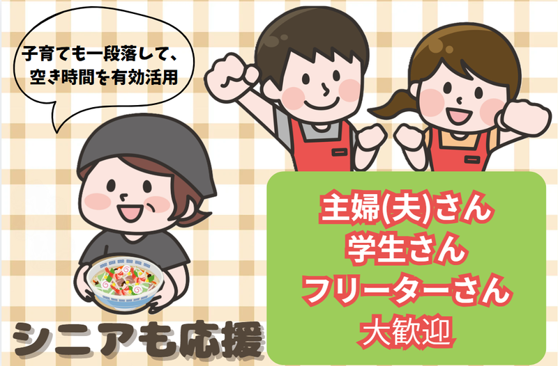求めている人材 *家事と両立する主婦(夫)さん応援! *学校帰りに働きたい学生さん大歓迎 *フルで入れるフリーターさん歓迎! *高校生も大歓迎 *WワークOK! *シニアも応援