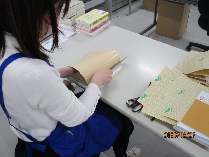 お家で本のフィルムコーティングを張り付ける作業