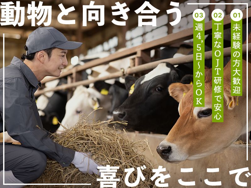 アピールポイント \\MOREポイント!// ◆柔軟シフトでプライベートも充実! 勤務は週4.5日から相談可能です。 Wワークやご家庭の都合、資格取得の勉強など、 あなたのプライベートやライフイベントと 仕事の両立を応援します! ◆ 頑張りをしっかり評価! 能力に応じて随時昇給のチャンスがあります! 会社の業績に応じて決算賞与も支給しており、 あなたの貢献を正当に評価します! <<【牛優先】の飼育方針>> 「急ぎすぎないで牛を大切に」をモットーに、 牛のリズムを守る丁寧な飼育方針です。 あなたの酪農経験を活かし、 生産性と牛の健康の両方を追求する、 やりがいのある環境です! =・=・=・=・=・=・=・= 「お気に入り」で保存! いつでも求人を確認できます! =・=・=・=・=・=・=・=