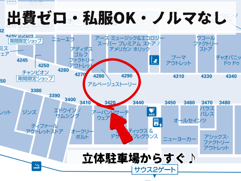 仕事内容 ・・SNSやメディアで話題︕有名⼥優やアナウンサーの着⽤アイテム多数・・ \ 週2⽇・5h〜OK︕隙間時間で賢く稼ぐ / ◇ Wワーク・副業歓迎︕私服勤務で無駄な出費ゼロ ◇ 【 おすすめポイント 】 ◆週20時間未満の短時間・扶養内勤務OK︕ ◆Wワーク・副業・掛け持ちバイト⼤歓迎 ◆進路決定済の⾼3⽣・専門学生・⼤学⽣歓迎 ◆社販不要︕稼いだ分はまるまる使える︕ ◆「⼟⽇だけ」「⼣⽅から」「朝活」などシフト⾃由⾃在 ◆「まずは4⽉から」「環境に慣れてから短期で」など開始時期も相談OK︕ ※進路決定済みの高校3年生も大歓迎!卒業旅行の資金作りにも◎ 《 お仕事内容 》 『Arpege story(アルページュストーリー)』にて、 店舗運営のサポート業務を中⼼にお任せします。 具体的に… ●お客様への接客・販売 ●品出し・商品整理 ●バックヤード整理 など ずっと⽴ちっぱなしの接客ではなく、 裏⽅での商品管理(品出しや整理)もバランスよくお任せしますので、 体⼒⾯が⼼配な⽅も安⼼してくださいね。 \\ メインのお仕事と両⽴しやすい // 難しい専⾨知識は必要ありません。 厳しいノルマも⼀切ないので、本業や家庭に負担をかけずに働けます。 「短時間でテキパキ働きたい」 「品出しメインで動きたい」など、 あなたの適性や希望に合わせてお任せするのでご安⼼ください。 「4⽉の⽣活リズムが落ち着いてからのスタート」や 「お⼦様の学校予定・履修登録に合わせたシフト調整」も柔軟に対応します︕ \\ フラットで働きやすい環境 // 数字を競うような環境ではないため、スタッフ同⼠も協⼒的な雰囲気です。 ノルマもないので、⾯倒な上下関係もありません。 「空いた時間でお⼩遣い稼ぎ」感覚でOKです◎ また、⽴体駐⾞場(サウス2ゲート近く)からもすぐなので、 ⾞・バイク通勤もとっても便利! アウトレット内なので、勤務前後のショッピングや気分転換も楽しめます︕ 《 当店について 》 20〜40代の⼥性に⼈気の下記ブランドが集まる直営ショップです。 ●Apuweiser-riche(アプワイザー・リッシェ) ●JUSGLITTY(ジャスグリッティー) ●Rirandture(リランドチュール) ●Mystrada(マイストラーダ) など 《 こんな⽅にオススメ 》 □未経験OK □経験者歓迎 □職歴・経歴不問 □フリーターさんOK □ブランクOK □Wワーク・副業OK □コミュニケーションを取ることが好きな⽅ □隙間時間を有効活⽤したい⽅ □扶養内で調整して働きたい⽅ □⾃分らしいスタイルで働きたい⽅ □接客経験を活かして効率よく稼ぎたい⽅