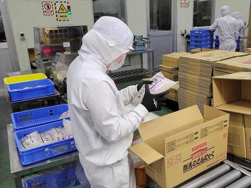 こんにゃく製品を梱包する機械の操作スタッフ