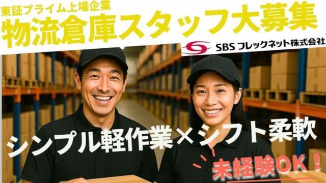 仕事情報 ● 仕事内容 夏は涼しく、冬は外気よりも暖かい快適な職場環境です。スーパーマーケットやコンビニ向けの食品の入出荷や仕分けのお仕事です。牛乳やヨーグルトなどの乳製品やお惣菜やお弁当など、普段の生活に欠かせない身近な商品を取り扱っていただきます。仕分け作業がメインなので、ご自身のペースで作業したい方にお勧めです! 未経験でも簡単お仕事 伝票のバーコードを読み込んで、荷物を種類ごとに仕分けするお仕事のため、間違いにくく初めての方も覚えやすい仕事です。モクモク・コツコツとお仕事したい方におすすめです。未経験者でも安心してお仕事を始められるように、先輩スタッフがやさしくサポートします!すぐにテキパキお仕事できますよ。 職場の雰囲気◎福利厚生◎ 職場内では役職者も含めて全員が「さん」付けで呼びあい、みんなが遠慮なく意見を言い合える環境づくりを心がけています。髪色・ピアス自由です。また、給与の前払いOK!スマホで簡単、振込手数料も全額会社負担です。休憩室やロッカーが完備しており、休憩時間は社内無料Wi-Fiを使って快適に休めます♪ 有休休暇のとりやすい環境 ご希望のお休みを取りやすい環境です。希望シフト提出時に、お気軽にご相談ください。お子様の学校行事も参加したい主婦(夫)の方や、プライベートの時間も大切にされたい方、家族と過ごす時間を大切にされたい方におすすめです。プライベートとお仕事のメリハリをつけて、健康的に楽しく働きましょう! SBSフレックネットとは SBSフレックネットがお届けするのは、お客さまの生活に欠かせない食品。会社の強みである輸配送全国ネットと、低温管理ノウハウは、お客さまの安心安全な「食の当たり前」を支えます。東証プライム上場グループで業界トップクラスの品質と実績を持つSBSフレックネットで更なる成長を目指し誇りをもってお仕事しませんか?