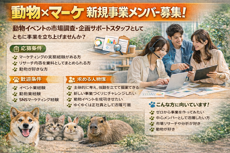 求めている人材 ■応募条件 【必須】 ・マーケティング実務経験がある方 ・リサーチ設計~分析~資料化までできる方 ・動物が好きな方 【歓迎】 ・イベント業界経験 ・動物業界経験 ・SNSマーケティング経験 ・データ分析が得意な方 ■このポジションの魅力 ✔ 新規事業の立ち上げに関われる ✔ 経営層と近い距離で働ける ✔ 裁量が大きい ✔ 将来的に正社員登用の可能性あり ✔ 事業責任者候補への道もあり ■勤務条件 勤務地:用賀駅 徒歩圏内(弊社事務所) ※リモート勤務も可能(出社歓迎) 勤務日数:週2~3日 勤務時間:1日4~6時間 時給:1,600円~(経験により優遇) 交通費:支給 PC:貸与 ■求める人物像 ・動物が好き ・指示待ちではなく、自ら仮説を立てられる ・市場分析が好き ・動物イベントを本気で成功させたい
