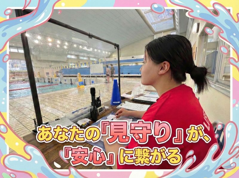 仕事内容 ♪+。.。・.。+。。.。・.。+♪ プールの安全を守る 「見守り役」のお仕事! ♪+。.。・.。+。。.。・.。+♪ 具体的には… ・プールサイドの巡回 ・来館者への注意喚起 ・更衣室の清掃 ・見回り ・館内アナウンス など 「泳ぎに自信がない…」 そんな方もご安心を! まずは清掃や巡回など、 できることからスタート。 ゆくゆくはアナウンス等、 幅広くお任せします! 実は、先輩の中には 「泳げないけど興味あり」 から始めて、卒業時には スイスイ泳げるようになったスタッフも♪ あなたの「やってみたい」 という好奇心を、 全力で応援する職場です!