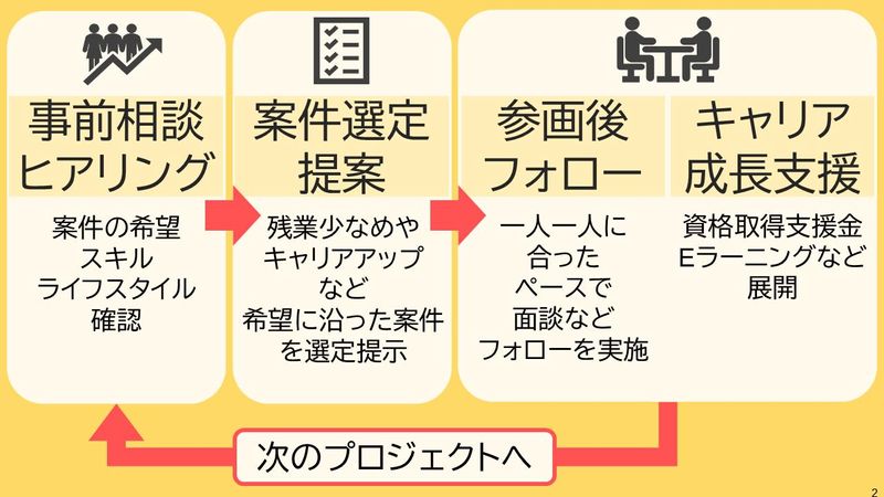 選考プロセス 【STEP 1】応募 【STEP 2】1次面接(web) ※1時間ほど予定しております ・当社についての説明 (30分) ・転職動機やこれまでの経験について(30分) 【STEP 3】内定 ※応募から内定までは約2週間を予定しています。 ※面接日・入社日は相談に応じますので、在職中の方もお気軽にご応募ください。