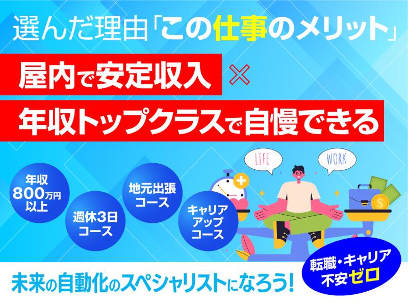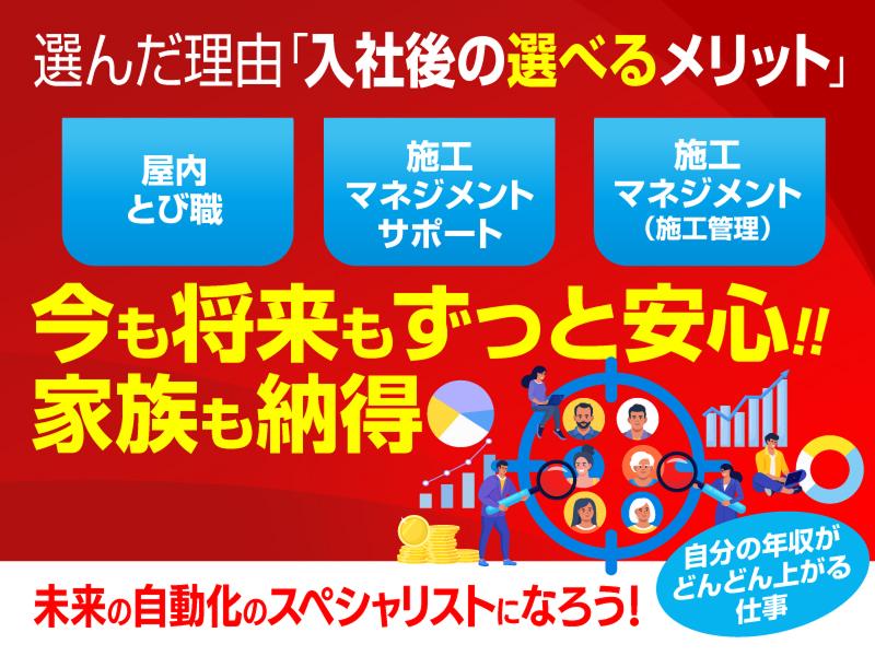 アピールポイント: 【ヤマモトSCで働く3つのメリット】 ①ゼロから新たなワークライフバランスが描ける ②未来も価値がアップする⤴エンジニアになれる ③経営幹部とともに育む未来の会社づくりができる 【こんな方にオススメです】 ①「この先10年、20年同じ仕事でいいのかな」と思って転職しました 手に職をつけて、長く安定して働きたい方へ →インフラや設備自動化など“なくならない業界”でキャリアを築けます ②安定して年収が伸びる仕事がしたい。そこで「未経験OK」と言われて転職しました 未経験から新しい仕事にチャレンジしたい方へ →初めての方でも安心の研修制度・サポート体制があります ③機械やパソコン相手だけでなく、ワイワイと仕事がしてみたいと思って転職しました 人と関わることや、段取りを考えるのが得意な方へ →現場のチームをまとめる“施工マネジメント”は、コミュニケーションが活きる仕事です ④ずっと一般社員の扱いでなく、リーダーやマネジャーになってみたいと思って転職しました 将来、リーダーや管理職として活躍したい方へ →ゆくゆくは現場の責任者へのキャリアアップも可能なんです 【未経験から“高年収”のプロになれます】 経験・資格は一切不要。異業種からの転職者も多数活躍中! 【年収アップ、安定生活へのサポートバッチリ】 入社後は先輩がマンツーマンでプロへの道をサポート。 チームワークバツグンの環境で、段階的に学べる育成体制があるから安心です 【将来性バツグンの安定企業!】 物流・半導体関連の自動化分野の成長とともに、長く必要とされる注目の仕事です AIに置き替えられない分野で、価値もUP! 【「自分にできるか不安…」という方でも大丈夫】 現場でのフォロー体制が整っており、20代~40代の未経験スタートの方が活躍中 将来のリーダー候補としての第一歩です