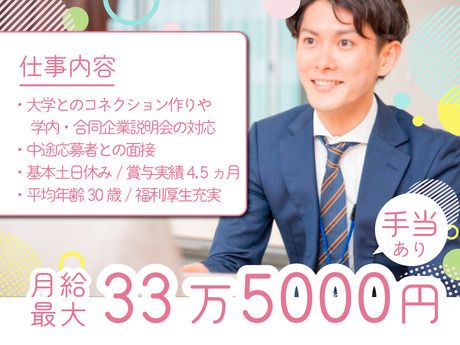 仕事内容 ◆これまでのご経験をもとに、できる業務からお任せしていきます。 あなたのコミュニケーション力を活かして 採用担当者としてスキルアップを目指しませんか? 経験者は即戦力として幅広くご活躍いただけます。 <新卒採用> 就職サイトの選定・運用 学生対応・面接対応 各種会社説明会の準備~運営 内定者フォロー など <キャリア採用> 媒体選定・求人の作成 応募者管理 面接対応 など ◆やりがい抜群!スキルアップも叶います!! 募集ツールの選定から面接担当、 入社後のフォローまで幅広く業務に携われます。 取り扱う職種は葬祭スタッフ、コーポレートスタッフ 営業職や技術職に至るまで多種多様。 様々な採用経験を積んで頂けるはずです。 正解がないと言われる採用業務において あらゆる事にチャレンジし一緒に成長していきませんか?! ≪一日のスケジュール(例)≫ 09:00~ 始業・応募者の確認と事務処理 10:00~ 選考者へ連絡し面接設定 12:00~ 昼食休憩(1h) 13:00~ 業者との打合せ(新規募集ツールの検討) 15:00~ 採用面接担当 16:30~ 採用担当間の打合せ(募集戦略の検討) 17:30 終業 ◆安定の業界&基本土日休みなど、ライフステージに寄り添う安心の福利厚生! 社員に長く安心して働いてもらう為に、 居住手当や昼食補助手当など安心の福利厚生の他 残業も平均10時間程度と少なめ! 安定して働きたい方にピッタリな環境です。 また、上記の福利厚生に加え、新卒採用においては 奨学金代理返還制度をスタート! 応募者へのアピールポイントも盛りだくさんで 採用活動を後押ししてくれます。 ◆努力・成果はしっかりと評価される環境です! 配属先となる「人財管理チーム」には 男性6名、女性4名の計10名が在籍。 わからない事・困った事は気軽に 質問ができる環境です。 また、本人の努力・成果を重視する社風の為 あなたの頑張りや成長はしっかりと 評価されます。