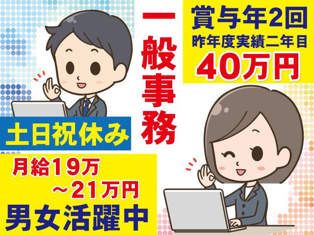 仕事内容 宮城県仙台市宮城野区にあります 「株式会社 ログ 仙台工場」では 一般事務の正社員を募集しています。 伝票の処理・整理、パソコンでの データ入力、電話応対、来客対応等を 行っていただきます。 当社は群馬県太田市を拠点とし 関東エリア、東北エリアの7つの工場にて 産業廃棄物処分業・運搬業を営んでいます。 仙台工場の事務所にて 事業運営を支えていただく 事務スタッフのお仕事になります。 =・=・=・=・=・=・=・= \アピールポイント/ ・パソコンの基本操作ができる方に 最適なお仕事です。 ・賞与年2回! (入社2年目/昨年度実績40万円) ・土日祝休みの週休2日制 (月に2回土曜出社有) =・=・=・=・=・=・=・= < 稼げます! > 賞与は年2回あり、 昨年度の実績は 入社2年目で40万円! 頑張ってくれる社員には できるだけ還元したいと 考えております。 ご家族の為、自身の将来の為、 たくさん稼ぎたいと考えている方、 ぜひご応募ください。 未経験からの方も多数活躍してます。