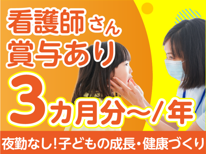 仕事内容 子どもたちの健康管理を中心に、看護業務や保育補助をお願いします。 病気を未然に防ぐ「予防」と子どもの成長を支える「健康づくり」がメインのお仕事です。 ★病院勤務と異なり、夜勤シフトは一切ありません! 【主な業務内容】 ・園児の身体測定や健康診断の補助 ・衛生管理、感染症予防対策 ・内服・与薬管理、回診介助 ・健康教育や保健だよりの作成 ・日々の健康観察や、ケガ・体調不良時の応急対応(嘔吐処理・異物除去・エピペン対応など) ・0~5歳児の保育補助(食事やお散歩のサポート、おむつ交換など)