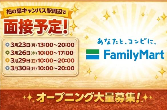 仕事内容 ★\オープニングスタッフ大募集/★ 「柏たなか駅」スグ!駅チカのファミマ♪ ✅ 4月末グランドオープン! 全時間帯合計20名の大募集チャンス♬ ୨୧┈┈┈┈┈┈┈┈┈┈┈┈┈┈┈┈┈୨୧ ✅ 週1日~OK 平日のみや土日のみも相談乗ります♬ ୨୧┈┈┈┈┈┈┈┈┈┈┈┈┈┈┈┈┈୨୧ ✅ 1日2時間~OK 希望に合わせてシフトの融通利きます! ୨୧┈┈┈┈┈┈┈┈┈┈┈┈┈┈┈┈┈୨୧ ✅ 同期がたくさん 全員同じところからのスタートで安心♪ ୨୧┈┈┈┈┈┈┈┈┈┈┈┈┈┈┈┈┈୨୧ ✅オープン前でも系列店で研修も可能! (TX線内のファミリーマート) ୨୧┈┈┈┈┈┈┈┈┈┈┈┈┈┈┈┈┈୨୧ *★⸜柏たなか駅から徒歩スグ!⸝★* 4月末新店舗がグランドオープンします!  ̄ ̄V ̄ ̄ ̄ ̄ ̄ ̄ ̄ ̄ ̄ ̄ ̄ ̄ ̄☆* ̄ ̄ ・お客様対応、接客 ・レジ ・品出し ・店舗内清掃 など… 時間帯により多少の変動はありますが、 コンビニの店舗スタッフ業務全般を お任せします*。٩(ˊᗜˋ*)و*。 / 他店舗へヘルプに行くことで 空いたシフトも埋められ、 時給もUPする制度あります✨✨ \ 当社はつくばエクスプレス沿線の つくば駅~秋葉原駅の間に 複数の店舗を運営中!! 社内システムにより 「授業前のこの時間暇だな~」とか 「今月はもっと稼ぎたいな!」 という時は他の店舗に ヘルプで入ることもできるんです! しかもヘルプで勤務すれば… ▶交通費は全額支給 ▶時給+200円~の手当も付 かなり美味しいシステム✨ 自分に合わせて働き方が カスタマイズできるファミマ♬ 同期がたくさんのチャンスにぜひ!