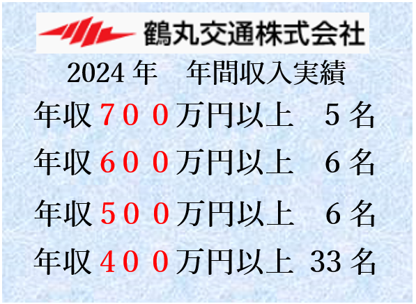 ■アピールメッセージ 2025年夏より歩合率がさらにUPしました! 【2025年7月の収入実績】 ・月収60万以上: 3名 凄すぎる!誰もがうらやむ超高収入! ・月収50万以上: 8名 自分を誇らしく思える高収入! ・月収40万以上:17名 頑張り次第でとにかく稼げる! ・月収30万以上:53名 真面目に働いた成果です! 【2024年の年間収入実績】 ・年収700万以上: 5名 安全運転!!安全第一!!の賜物です! ・年収600万以上: 6名 目的地はお客様の未来です! ・年収500万以上: 6名 地域貢献が誇りです! ・年収400万以上:33名 お客様とドライバー仲間に感謝!